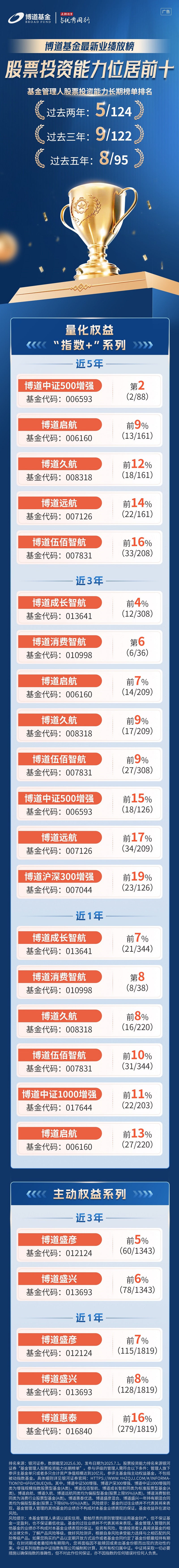 根据银河证券最新排名,博道基金的股票投资能力近2年、近3年、近5年皆跻身行业前十。